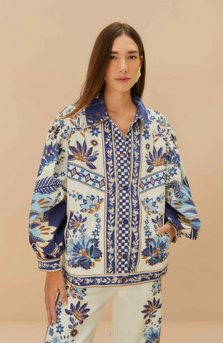 Turquoise Palm Tree Tapestry Blue Wavy Yoke Blouse