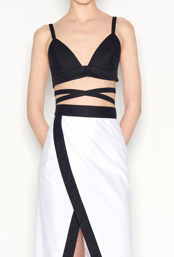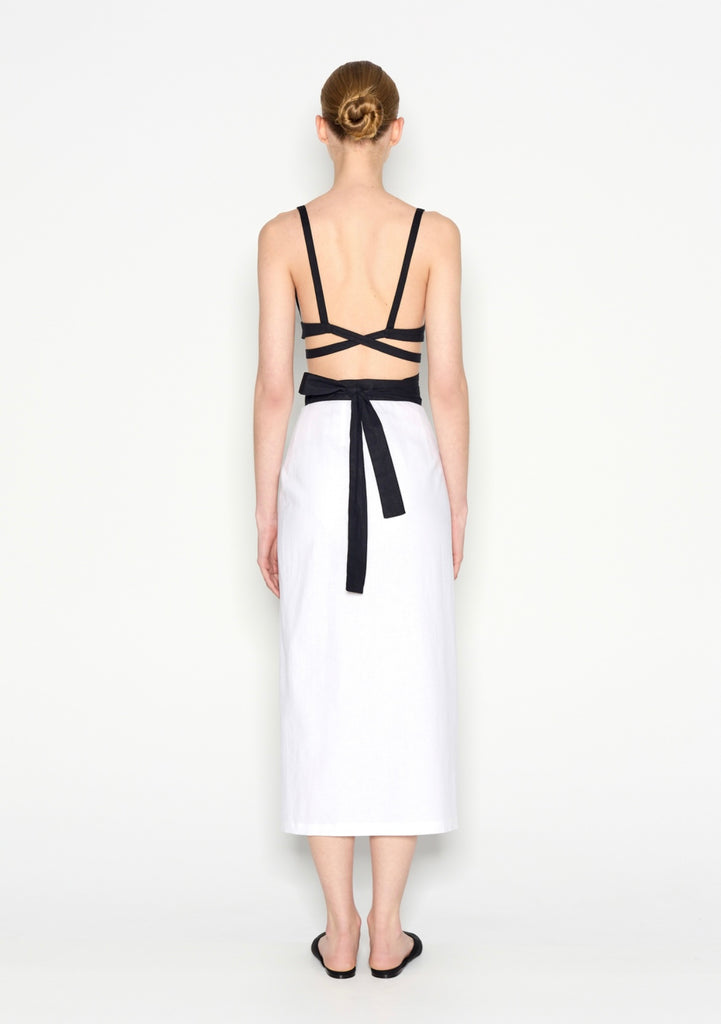 The Vice skirt stands out in a sharp white and black palette, defined by clean lines and precise detailing. Designed for versatility, the structured silhouette is accented with a black belt-inspired detail. It moves seamlessly between pared-back daytime looks and more elevated evening styling. This item is crafted from linen for comfort, shape, and lasting presence.