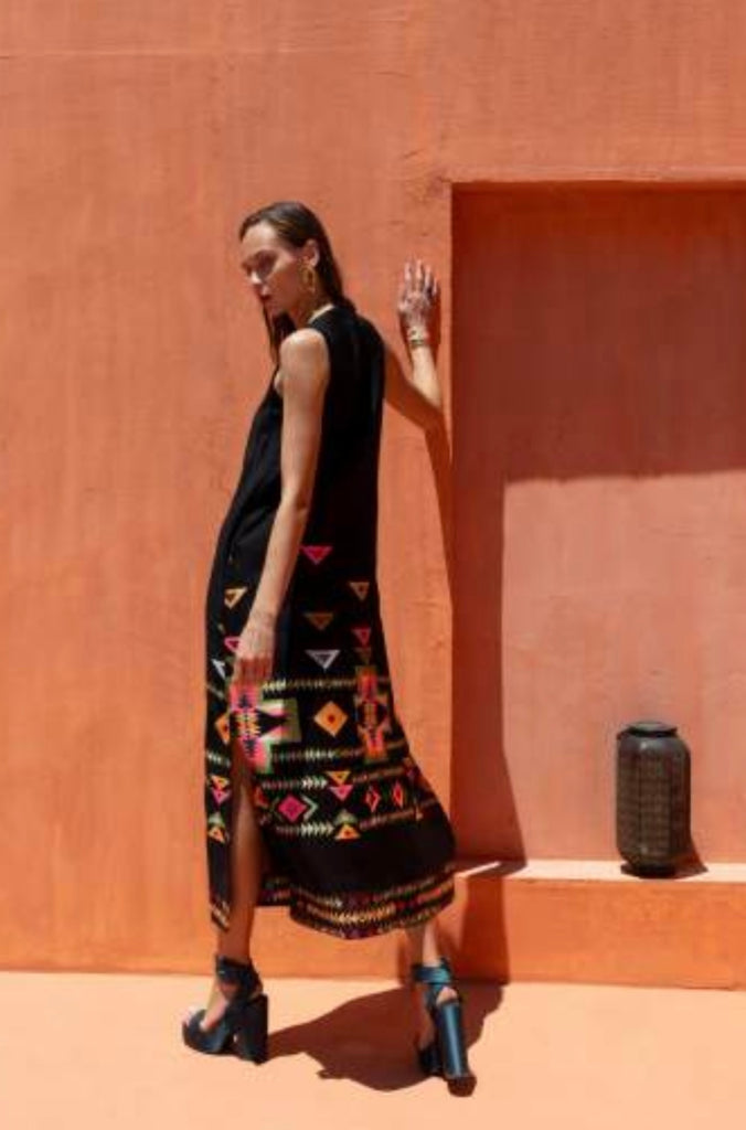 Sleeveless black dress with colourful embroideries