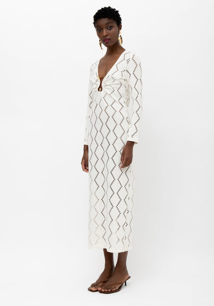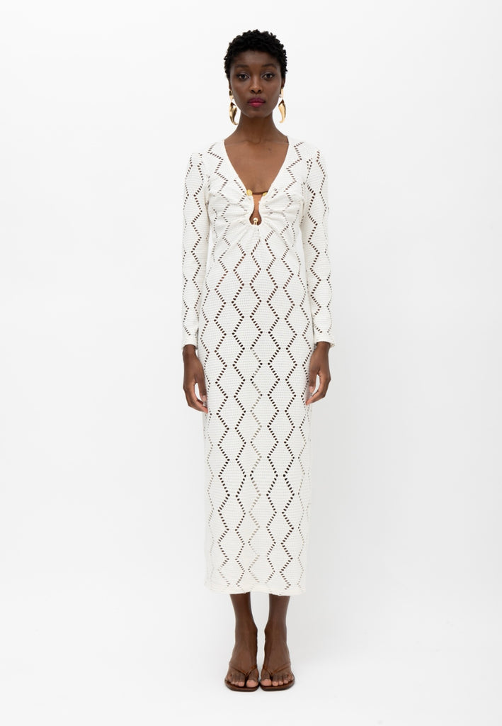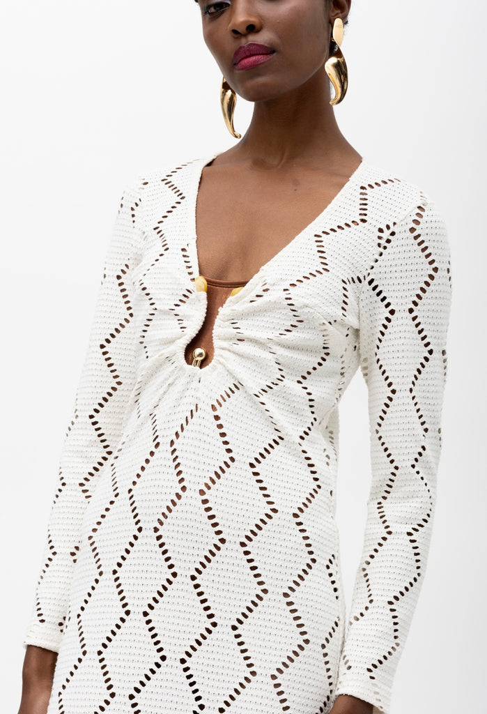 A stunning embodiment of bohemian elegance, this crochet dress is a timeless chic option for your island walks. The deep-V neckline, combined with the gold detail makes it a true statement piece