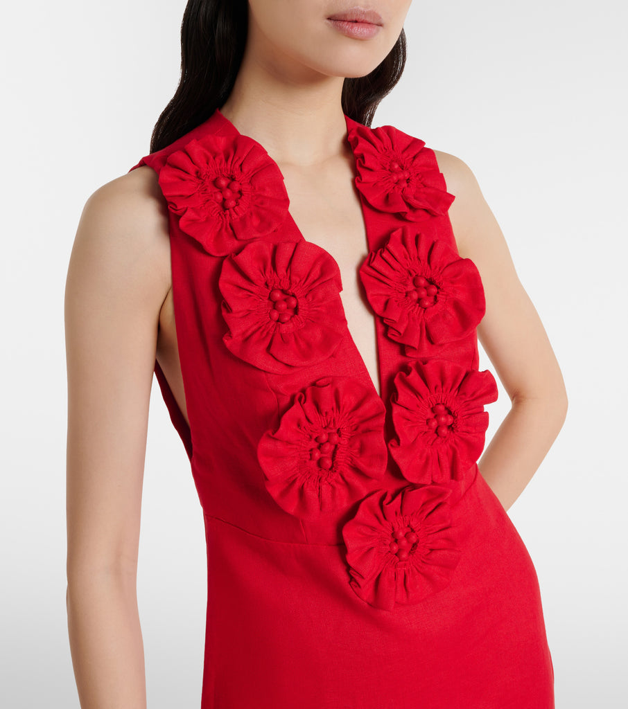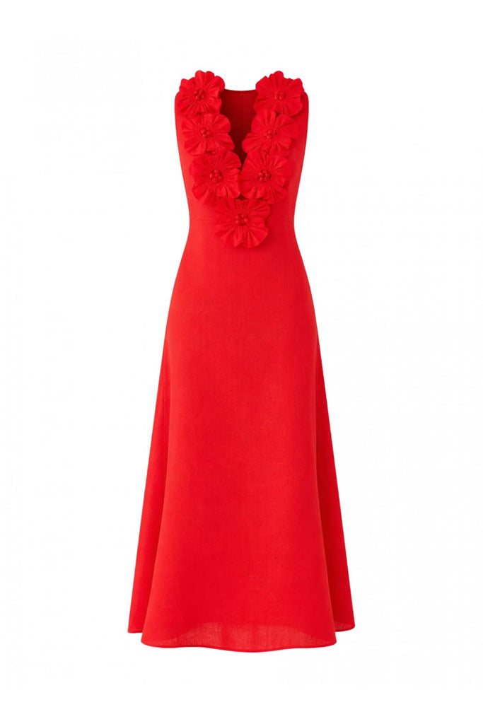 Description: This refined red sleeveless midi dress brings effortless elegance to your warm-weather collection. Crafted for sun-filled days, it features charming floral embellishments framing the neckline and a generously cut skirt that allows for comfortable, unrestricted wear. An ideal choice for spring and summer occasions, this dress embodies understated sophistication and versatile style.